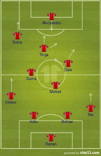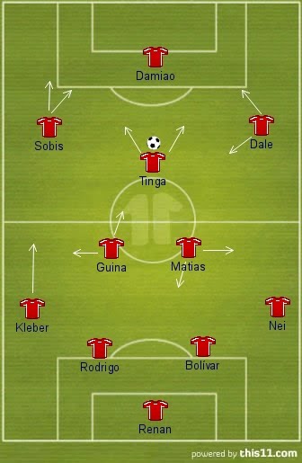 Com as saídas quase certas de Giuliano e Alecsandro, este seria o desenho tático de como o Inter pode começar o torneio continental das Américas.